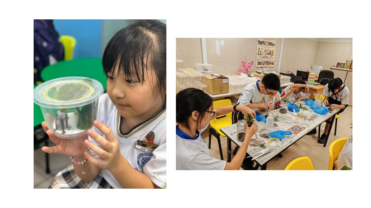 The department curates lesson units that are paired with science kits to facilitate experiential learning. These resources provide students with the materials and guidance they need to conduct their own experiments and explore scientific concepts on their own. For example, at Primary 2, students are provided with butterfly kits as they learn about the life cycle of a butterfly, in collaboration with the English Department. This interdisciplinary approach allows students to strengthen both their scientific understanding and language skills. At Primary 5, students construct their own terrarium sets to observe the water cycle in action and understand its importance to living things and the environment around them.